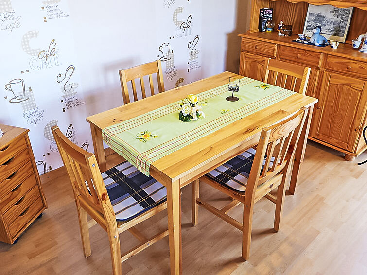 Huis in een rij 3-kamers 54 m2, op de begane grond. Gezellig ingericht: woon-/eetkamer 22 m2 met Sat-TV en radio. Uitgang naar het terras. 1 kamer 8 m2 met 1 2-pers bed (2 x 100 cm, lengte 200 cm). 1 kinderkamer 6 m2 met 1 x 2 stapelbedden (90 cm, lengte 190 cm). Kleine keuken (4-pits kookplaat, oven, magnetron, elektrische koffiemachine). Douche/WC. Klein terras. Terrasmeubelen. Ter beschikking: kinderstoel. Internet (WiFi, gratis). Rookvrij huis. Maximaal 1 huisdier/hond toegestaan. Rookmelders.