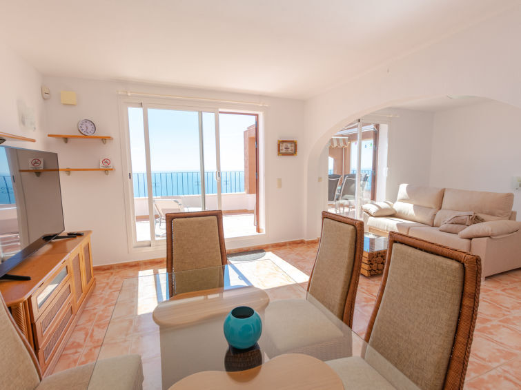 "Azul Celeste", appartement 4-kamers 104 m2 op 2 verdiepingen. Licht, comfortabel en mooi ingericht: woon-/eetkamer met Sat-TV (Flatscreen TV), air-conditioning. Uitgang naar het terras. 1 kamer met 1 2-pers bed (1 x 160 cm, lengte 200 cm), air-conditioning. Open keuken (oven, 4 keramische glas kookplaten, broodrooster, waterkoker, magnetron, diepvriezer, elektrische koffiemachine). Douche/WC. Geen verwarmingsmogelijkheid. Souterrain: 1 kamer met 1 2-pers divanbed (1 x 140 cm, lengte 200 cm) (lengte 200 cm), air-conditioning. 1 kamer met 1 2-pers bed (1 x 160 cm, lengte 200 cm), air-conditioning. Bad/WC. Groot terras 20 m2. Terrasmeubelen. Mooi panoramazicht op zee. Ter beschikking: wasmachine, strijkijzer, haardroger. Internet (WiFi, gratis). Niet rokers woning. Maximaal 1 huisdier/hond toegestaan. Toegang tot het zwembad met 73 treden. VT-494596A // Reg. Nr.: ESFCTU000003038000055871000000000000000000VT-494596A7