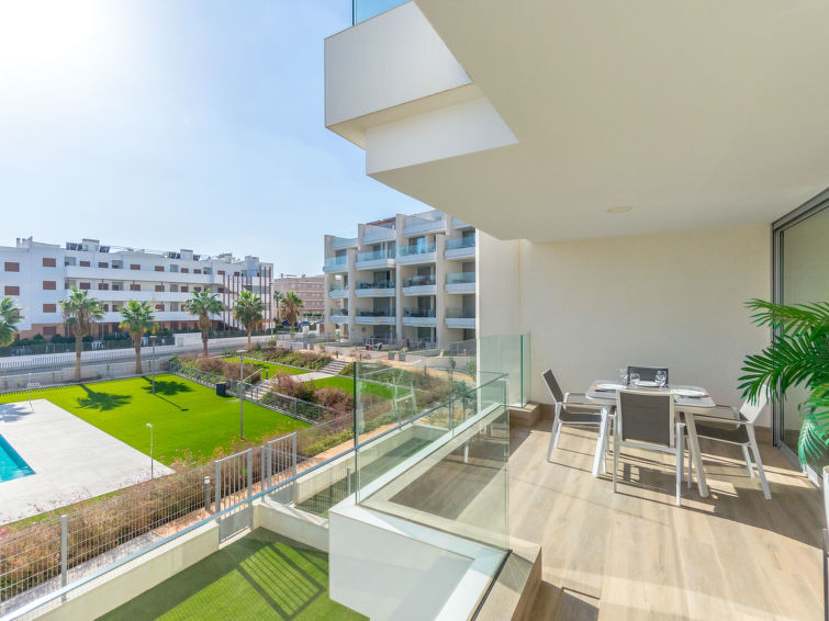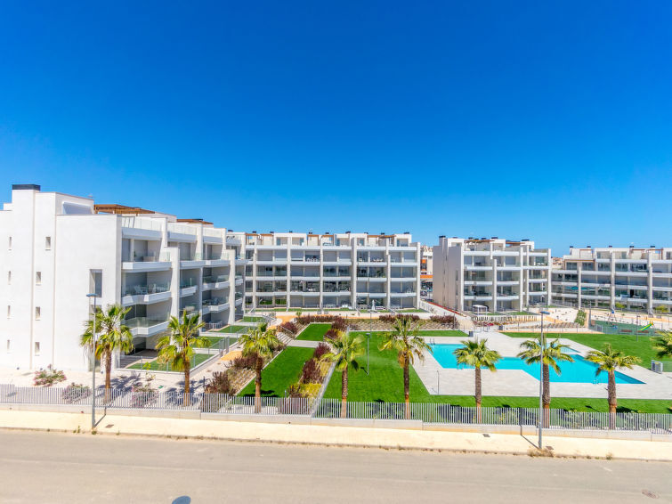 Moderne, mooi flatgebouw "Ema Residencial", van 4 verdiepingen, bouwjaar 2023. 3 km van het centrum van La Zenia, 4 km van het centrum van Punta Prima, 7 km van het centrum van Dehesa de Campoamor, gebied met weinig verkeer, 2.8 km van zee, 2.8 km van het strand. Voor medegebruik: terrein (omheind), openluchtzwembad (seizoensgebonden beschikbaarheid: 01.Jan. - 31.Dec.). Kinderzwembad, buitendouche, kinderspeelplaats. In het huis: lift. Levensmiddelenwinkel, supermarkt 950 m, restaurant 100 m, bushalte "Platja Flamenca – Mercadillo" 350 m, treinstation "Orihuela" 27 km, zandstrand "Playa la Zenia" 3 km. Golfterrein (18 holes) 1.9 km. De eigenaar accepteert geen groepen.